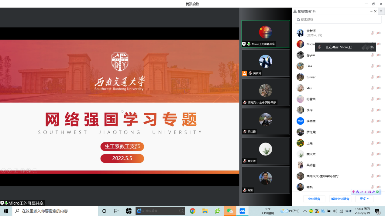2022-05-17为深入学习贯彻习近平总书记重要讲话精神,进一步强化支部成员感恩党、听党话、跟党走的思想和行动自觉,5月13日20:00,生命科学与工程...