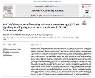 江育虹副教授长期从事PAR2受体对疾病调控的作用机制研究,率先利用CRISPR/Cas9基因编辑系统,同时借助纳米技术,敲除肿瘤炎症环境的PAR2基因,以探讨PAR2对肿瘤调控的新作用机制。研究发现敲除PAR2后抑制肿瘤炎症微环境中NLRP3炎症小体/IL-1β等通路,进而放大干扰素基因刺激因子STING信号转导,促进肿瘤免疫,最终阻止肿瘤转移。近日,该研究成果发表在药学TOP期刊Journal of Controlled Release (IF=10.8)上,题为“PAR2 deficiency tunes inflammatory microenvironment to magnify STING signalling for mitigating cancer metastasis via anionic CRISPR/Cas9 nanoparticles”。