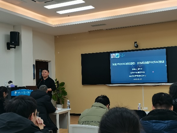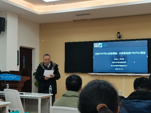 李子刚教授,芝加哥大学博士,北京大学化学生物学与生物技术学院执行院长,深圳湾实验室坪山生物医药研发转化中心主任,在蛋白降解靶向嵌合体(PROTAC)研发方面有着深入的研究和丰富的经验。讲座伊始,李教授首先对PROTAC技术的基本原理和发展历程进行了系统的介绍,使在场师生对这一前沿技术有了清晰的认识。随后,李教授重点阐述了其团队提出的“分而后合”的PROTAC研发新策略。他指出,传统的PROTAC研发逻辑往往存在一些局限性,而“分而后合”的策略能够有效解决这些问题。该策略的核心在于先对PROTAC的各个组成部分进行深入研究和优化,再将它们组合起来,从而提高PROTAC的稳定性和降解效率。李教授通过一系列详实的实验数据和案例分析,生动地展示了这一策略在实际研发过程中的应用效果和优势,引发了在场师生的浓厚兴趣和热烈讨论。