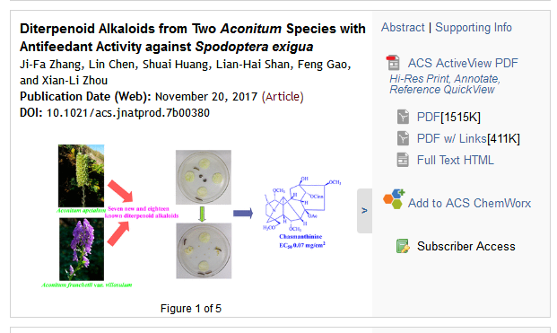 周先礼教授带领的“小分子天然药物”创新团队最新研究成果Diterpenoid Alkaloids from Two Aconitum Species with Antifeedant Activity against Spodoptera exigua在天然药物化学领域顶级期刊《Journal of Natural Products》上在线发表(DOI: 10.1021/acs.jnatprod.7b00380)。博士生张吉发为论文第一作者,高峰教授和周先礼教授为通讯作者。该研究从两种乌头属植物(空茎乌头和展毛大渡乌头)中分离鉴定了7个新的和18个已知的二萜生物碱,发现了新颖的植物源驱虫剂的先导化合物。