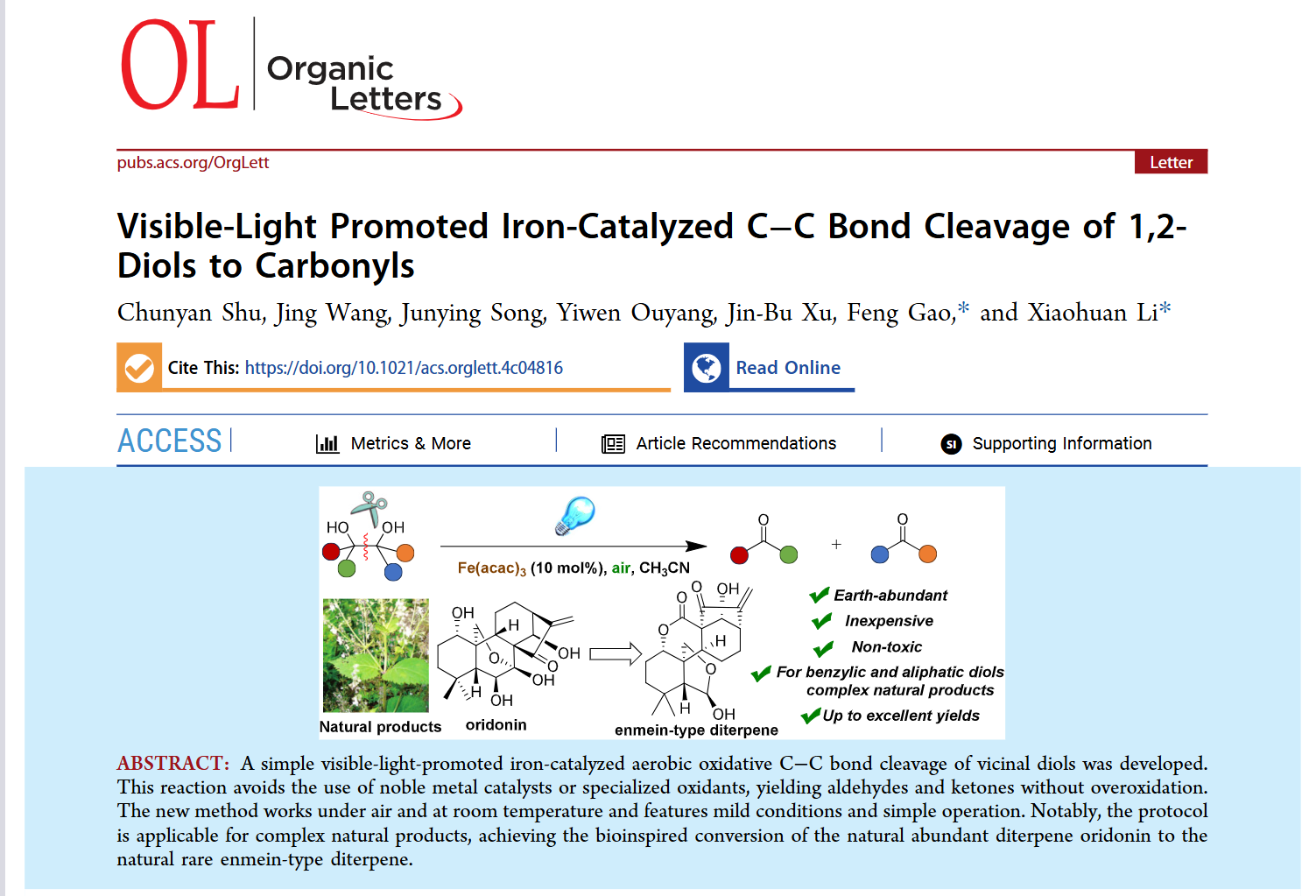 “活性天然产物成药性研究”实验室的最新研究成果“Visible-Light Promoted Iron-Catalyzed C–C Bond Cleavage of 1,2-Diols to Carbonyls”。2022级硕士研究生舒春艳为第一作者,高峰教授和李晓欢副教授为通讯作者,麻豆社