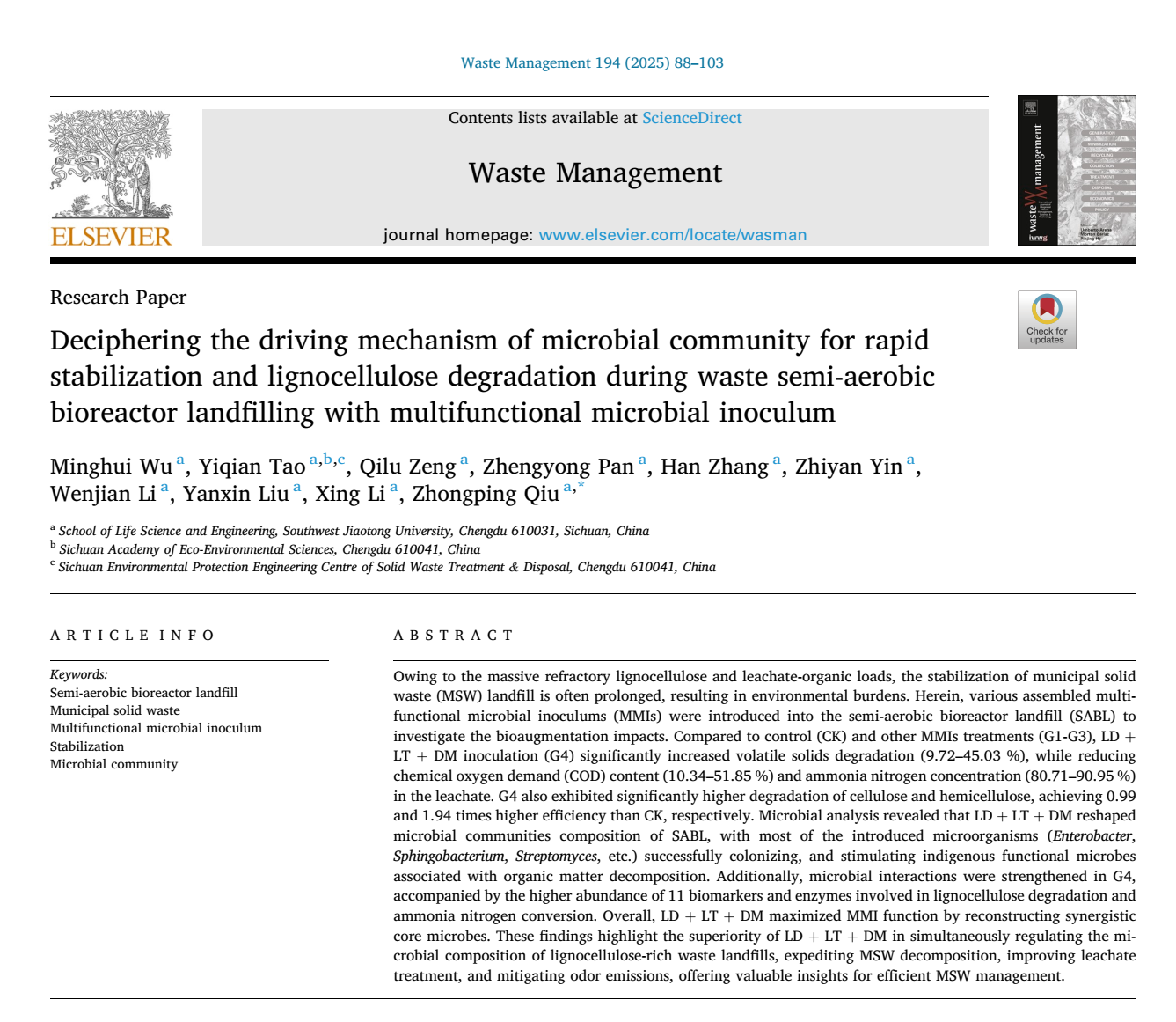 “资源微生物技术”邱忠平教授团队的研究成果“Deciphering the driving mechanism of microbial community for rapid stabilization and lignocellulose degradation during waste semi-aerobic bioreactor landfilling with multifunctional microbial inoculum”。论文通讯作者为邱忠平教授,第一作者为吴明蔧老师,麻豆社