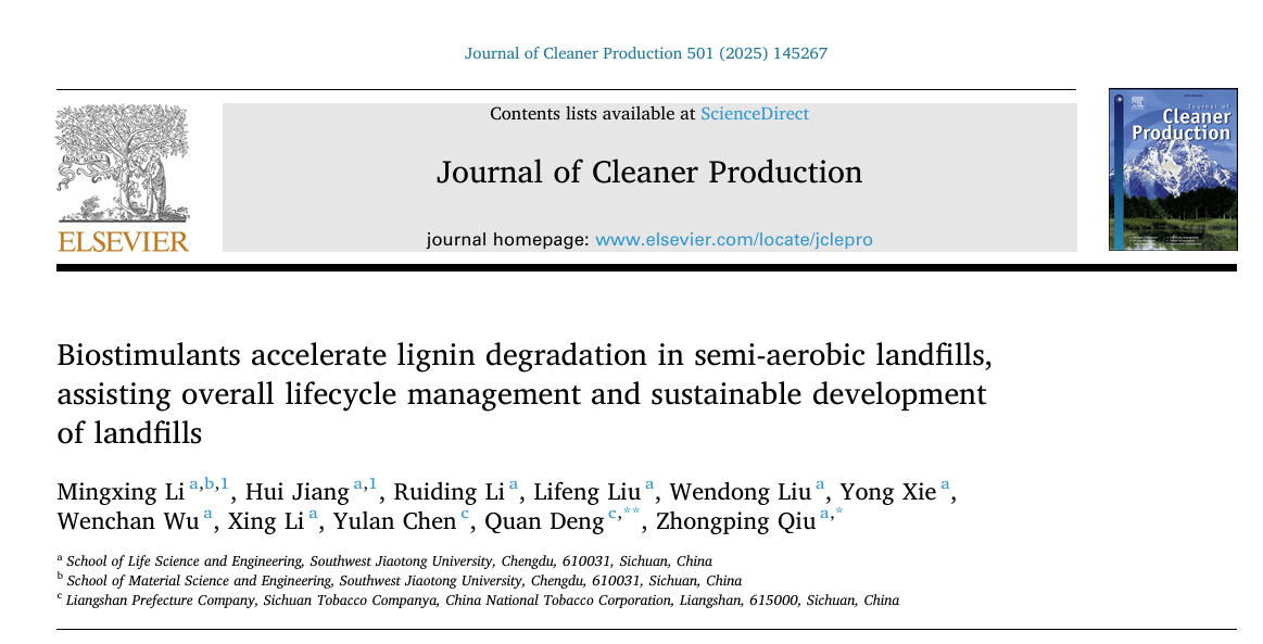 邱忠平教授团队的研究成果“Biostimulants accelerate lignin degradation in semi-aerobic landfills, assisting overall lifecycle management and sustainable development of landfills”,2021级博士研究生李明星与2022级硕士研究生江慧为共同第一作者,通讯作者为邱忠平教授,麻豆社