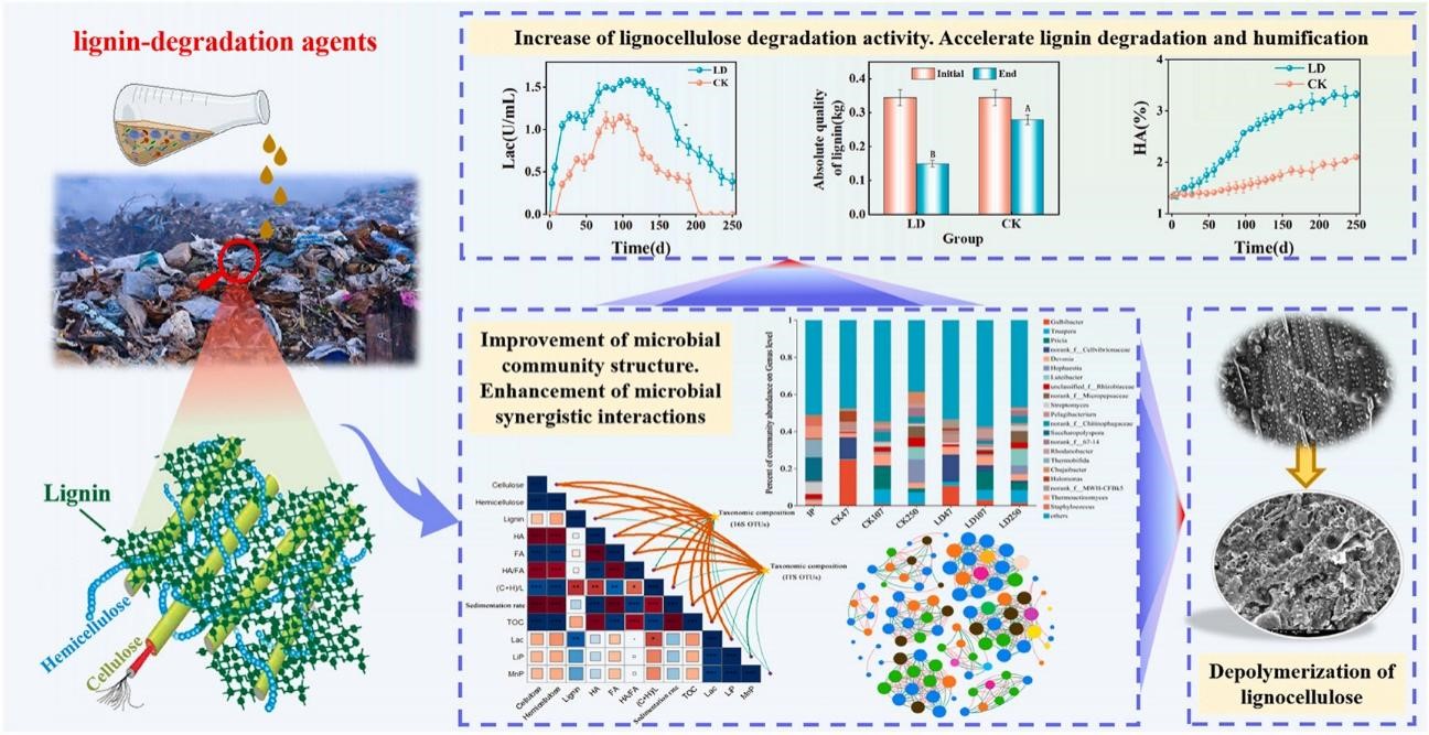 文章亮点:利用天然微生物菌群强化了垃圾填埋场中木质素的降解,使木质素含量降低46.43%;天然微生物菌群通过促进漆酶的分泌实现木质素的降解;天然微生物菌群重塑了场内中的微生物群落,优化微生物间的相互作用,促进了填埋体系中多种木质素降解土著微生物的富集。