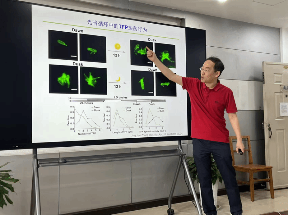 赵坤教授的报告题目为:四型菌毛——细菌的微纳“瑞士军刀”。四型菌毛(Type IV Pili, TFP)是直径在5-8纳米,长度可达几微米的蛋白丝,是细菌表面常见的一类附属结构。近年来的研究揭示了其在越来越多的细菌行为中扮演着非常重要的角色,包括细菌的表面粘附、表面感知、表面运动,细菌生物被膜的形成以及自然转化等。在本次报告中,赵坤教授展示了课题组近期在TFP研究领域开展的一些研究:借助菌毛染色技术,通过在单细胞水平上实时原位观测TFP在细菌不同行为中的表型,解析了TFP在多种细菌行为中的作用机理以及相应的调控机制;在蓝细菌中,揭示了TFP具有的生态学功能,进一步拓宽了人们对于TFP在微生物行为中作用的认知。