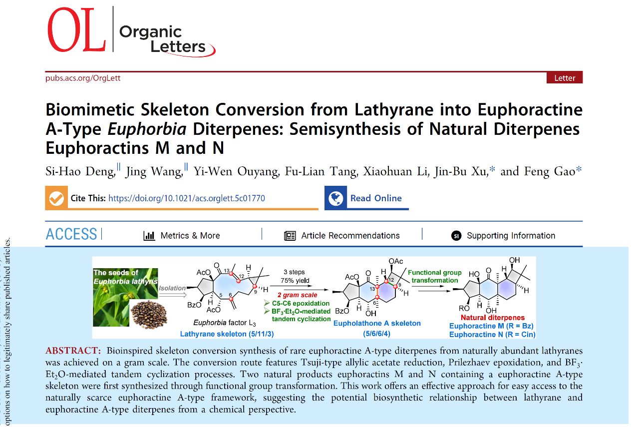 高峰教授团队的最新研究成果“Biomimetic Skeleton Conversion from Lathyrane into Euphoractine A‑Type Euphorbia Diterpenes: Semisynthesis of Natural Diterpenes Euphoractins M and N”。硕士研究生邓思浩和王婧为第一作者,硕士研究生欧阳艺文和唐博莲,以及李晓欢副教授参与该项工作,高峰教授和徐巾卜助理教授为通讯作者,麻豆社
