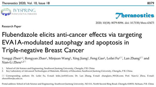 周先礼教授团队在《Theranostics》上以我校为唯一署名单位发表了题为“Flubendazole elicits anti-cancer effects via targeting EVA1A-modulated autophagy and apoptosis in Triple-negative Breast Cancer”的研究论文,揭示了氟苯达唑通过靶向EVA1A调控自噬与凋亡机制抑制三阴性乳腺癌(Triple-negative breast cancer,TNBC)的生长和转移,从而发挥的抗肿瘤作用。《Theranostics》(IF=8.579)是中科院医学1区TOP期刊,2019年CiteScore值达到10.8,位列药理学、毒理学和药剂学(综合类)分区第1名,医学(综合类)分区第4名。