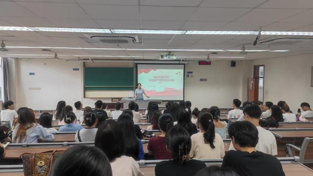党委于九里校区J4323教室举办新党员入党宣誓及党员重温入党誓词活动。此次活动特邀学院党委书记黄春蓉为新发展党员讲党课。全体预备党员、支委会委员和党员代表参加了本次活动。