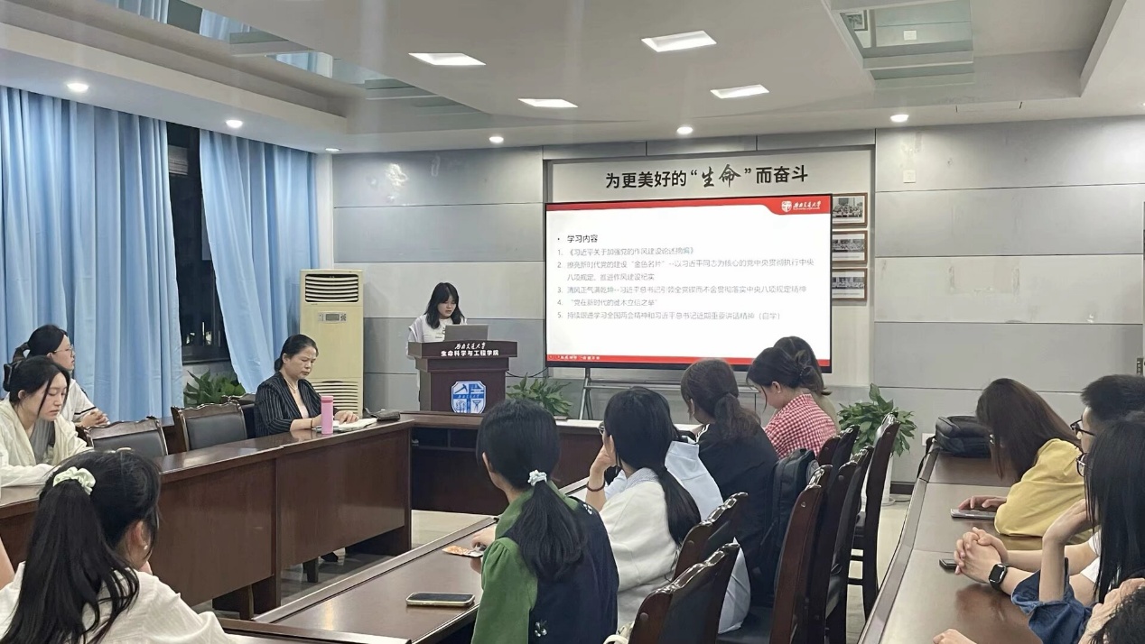 然后,学院党委书记黄春蓉为支部党员讲党课。黄春蓉指出,本次学习教育活动旨在引导党员同志认真学习领会习近平总书记关于加强党的作风建设的重要论述,增强党员同志的纪律意识和规矩意识,并将其内化于心、外化于行,提高党性修养,形成良好的学风和院风。黄春蓉结合具体案例,让同学们对深入贯彻中央八项规定精神学习教育有了更直观、更深刻的认识。她强调加强党的作风建设是一项长期而艰巨的任务,关乎党的形象和事业发展,全体党员同志要以身作则,发挥模范带头作用。