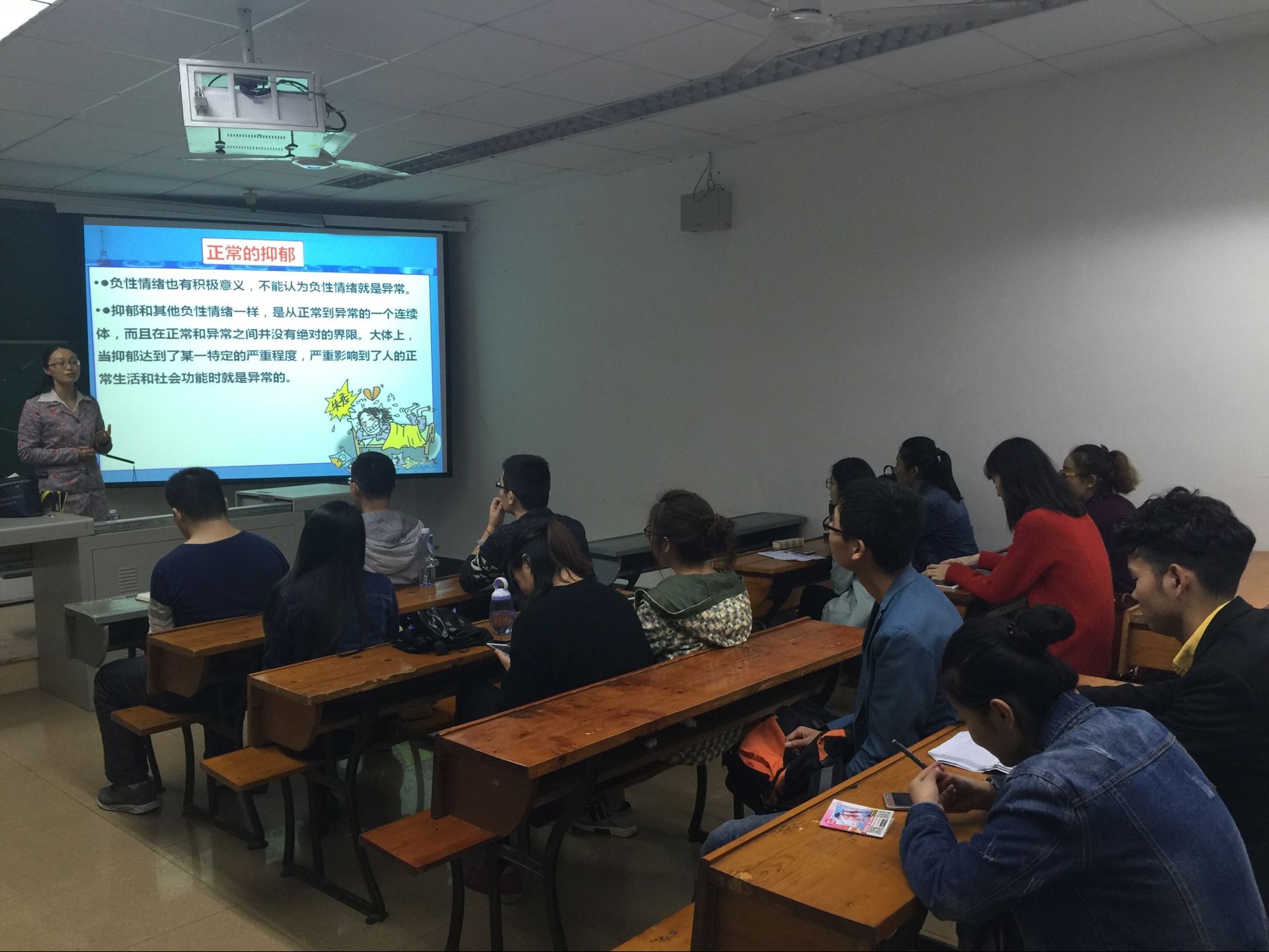唐静老师的讲座题为“别了,灰色的心灵风暴——抑郁症”。首先,她以轻度抑郁状态为例,向大家澄清了大多数人对抑郁症的一些误解,并指出,正常的抑郁情绪不等于抑郁症,异常的抑郁情绪才会导致抑郁症的发生,其本身是一种相当严重的精神疾病。紧接着,为了让同学们更直观地了解抑郁症的危害,她假定不同的场景,让同学们深刻体会抑郁情绪带给大家的负面影响。此外,唐老师由浅入深,从生物学角度解释了抑郁的起因,大脑中神经细胞之间递质5-羟色胺传递功能下降是抑郁情绪产生的生物基础。最后,她结合大学生的实际情况分析了大学生抑郁的原因,建议我们要适当进行自我调节,如通过唱歌、跑步、打球等活动,以保持积极乐观的心态面对学习和生活。