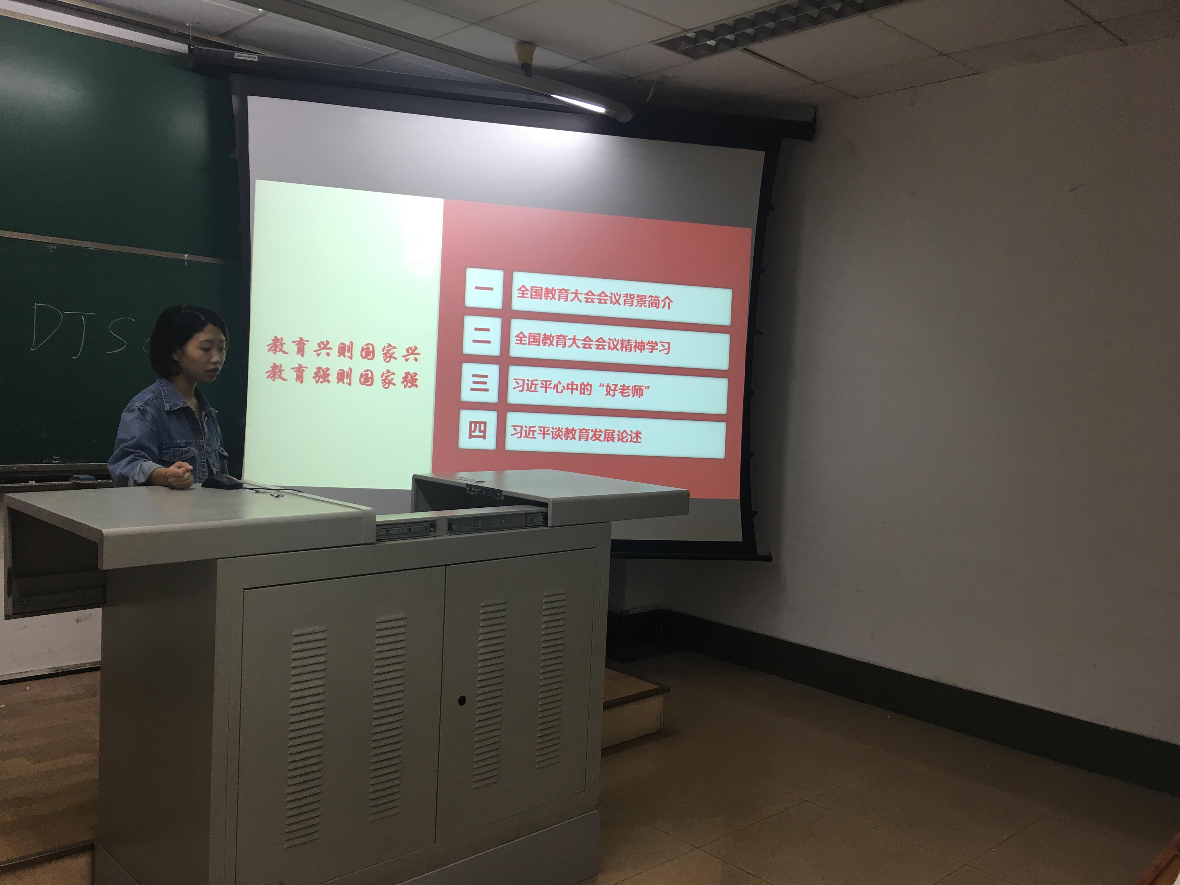 为学习贯彻全国教育大会精神,学院2017级、2018级硕士研究生党支部于11月1日晚在逸夫馆4304B教室联合开展了以“学习教育大会精神,为学校建设凝心聚力”为主题的党日活动。活动由2017级研究生党支部书记孙源同志主持,2018级党支部书记王珏同志主讲,两个支部的党员参加了活动。