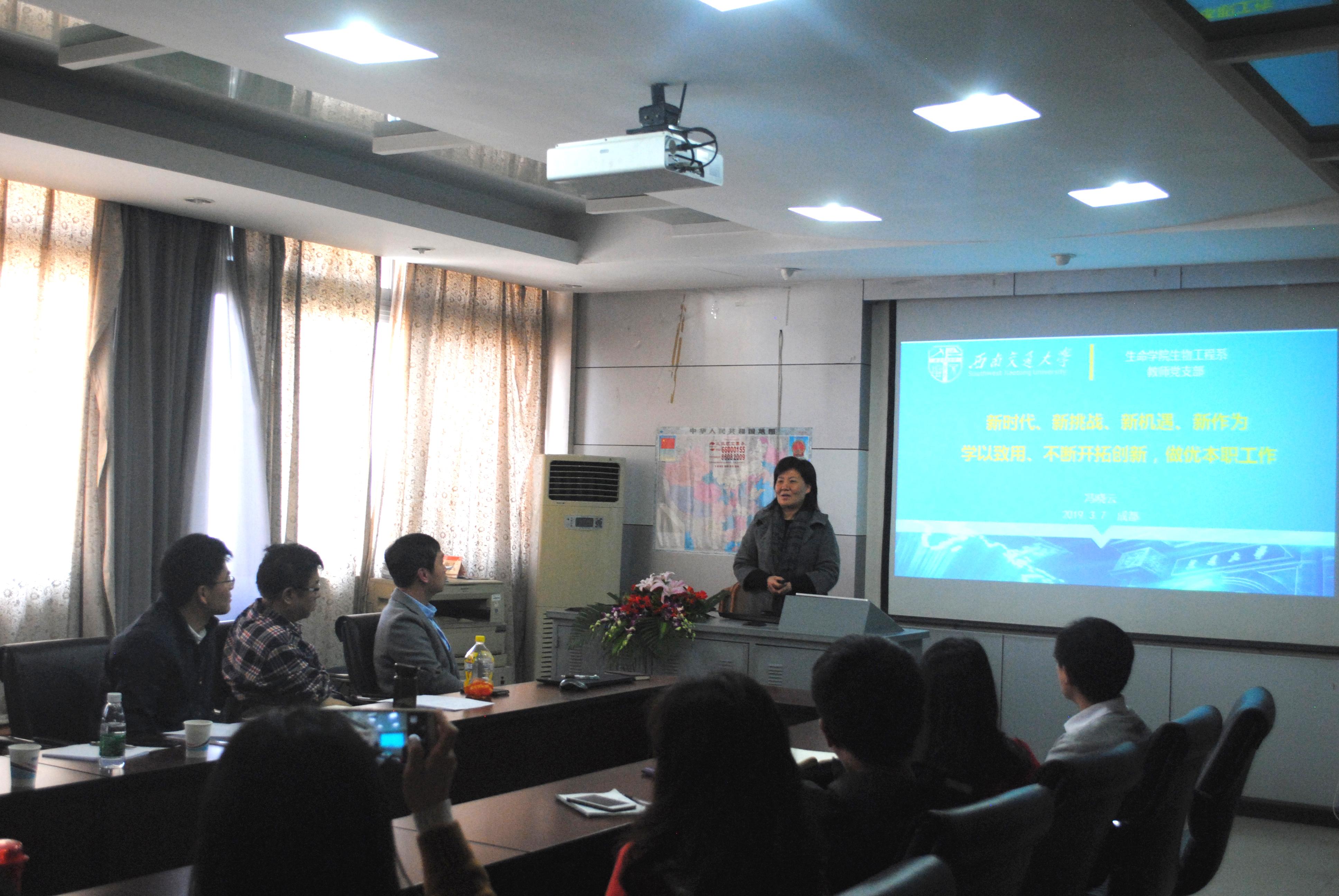 3月28日下午,生物工程系全体党员教职员工齐聚九里校区电气馆3609,开展习近平总书记在高校思政教师座谈会上讲话精神的集中学习,围绕“立德树人”全面推进生命板块人才培养工作进行研讨,冯晓云副校长来到学院参加了本次主题学习活动并作了重要讲话。麻豆社