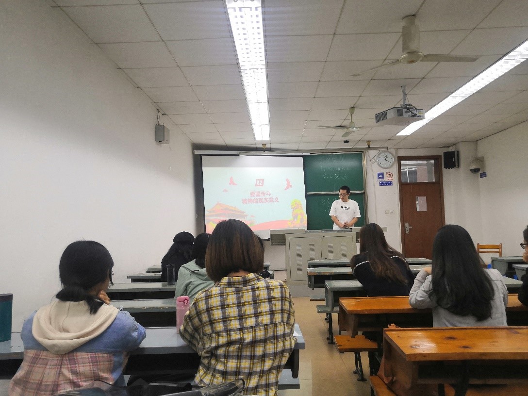 第一个环节,由党支部书记吴京川同志开展,吴京川同志首先点明爱国奋斗精神是新时代高扬的主旋律,爱国不是口号而是经年累月的情感积淀,爱国不是高谈阔论而是攻坚克难的负重前行。其次,吴京川同志说到,爱国奋斗精神具有现实意义,踏上新征程必须弘扬爱国奋斗精神,才能实现中华民族伟大复兴的中国梦;当今世界正处于大发展大变革大调整时期,应对新挑战必须弘扬爱国奋斗精神。“那么我们又该如何践行爱国奋斗精神呢?”吴京川同志发出提问。接着他对此做出了比较全面的回答,践行爱国奋斗精神,就要爱国爱党,爱社会主义并坚持党的领导,树立“四个意识”,增强对党和国家奋斗目标的思想认同,情感认同和价值认同。作为研究生党员,我们要面向实际,深入实践,稳扎稳打,苦干实干,不仅做到有理想还要做到有学问,在本职岗位上做好自己的工作。