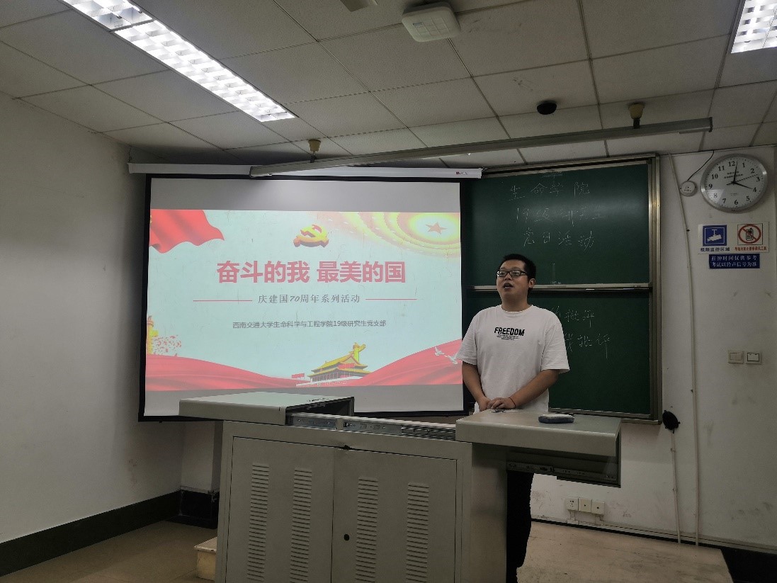 2019级研究生党支部也顺势开展了“奋斗的我,最美的国”的教育活动。活动于10月8日下午16:00在教室J4305a开展,此次活动由党支部书记吴京川同志主持。