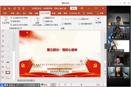 本科生工党支部组织生活会议通过腾讯会议顺利召开。会议主题为“迎党的生日、讲战疫故事,悟初心使命”,本次会议由党支部党员李佳玉主持,党支部全体成员参与。
