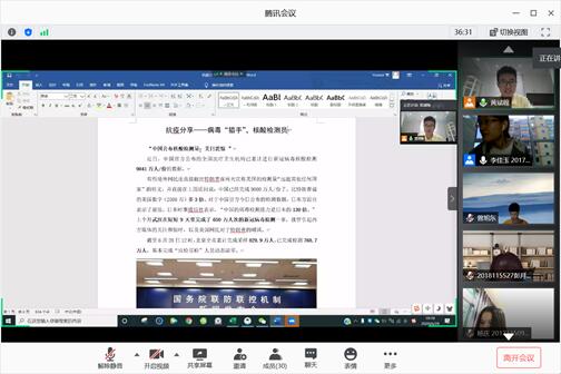 会议第二部分内容是分享疫情期间先进党员战疫经历或先进事迹,对了解到的疫情期间先进党员事迹进行交流和学习。通过对优秀党员在疫情期间奉献经历的了解学习,加深了大家对于党员身份的责任感和归属感。党员黄斌翰通过视频共享、文字描述,给大家讲述了疫情中核酸检测员这一群体的贡献与作为,并结合到我们所学专业生物工程给予大家勉励,希望党支部成员都学有所成,更好地为人民服务。