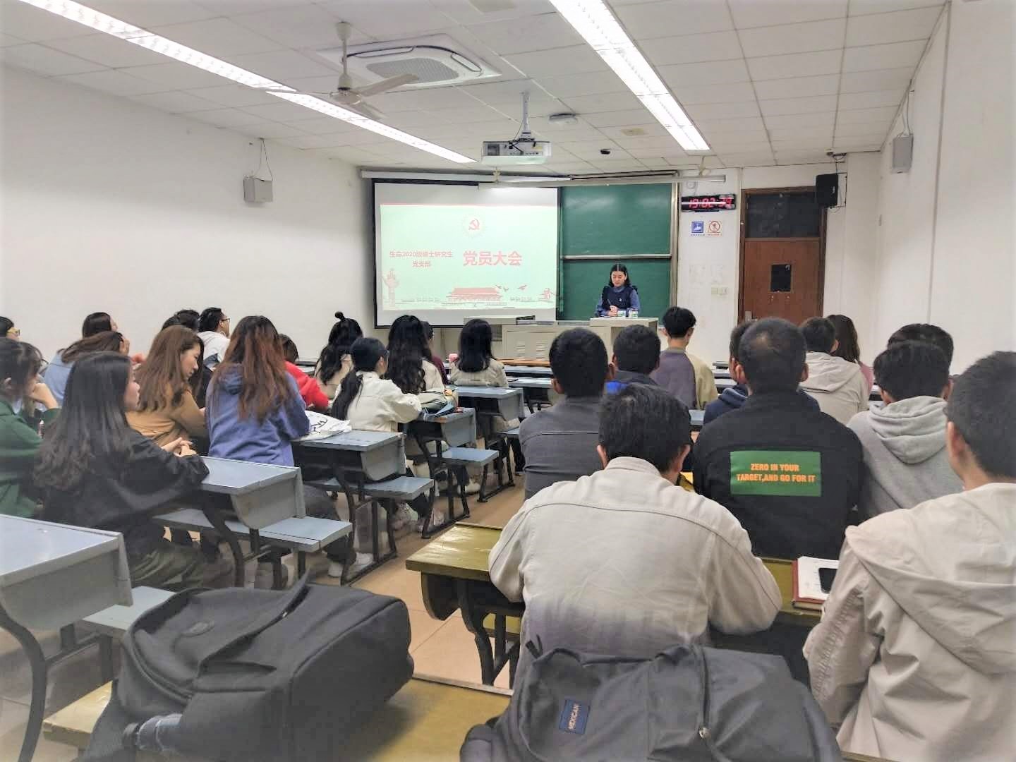 2020级硕士研究生党支部成立大会暨第一次党员大会在逸夫馆4405A教室召开,34名党员同志参会,会议由党支部指导老师兰卓主持。