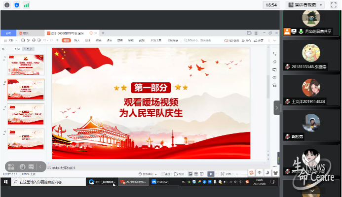 会议伊始,彭月华同志带领支部成员观看了为人民军队庆生的视频。“若有战,召必回,战必胜”是战士们捍卫国土、保家卫国的口号,“一声到,一生到”是人民军队用生命和鲜血坚守的信念。我们生在红旗下,长在春风里,我们的幸福,都是战士们的牺牲和守护换来的。正值八一建军节,我们理应向每一位替我们负重前行的人民英雄致敬。