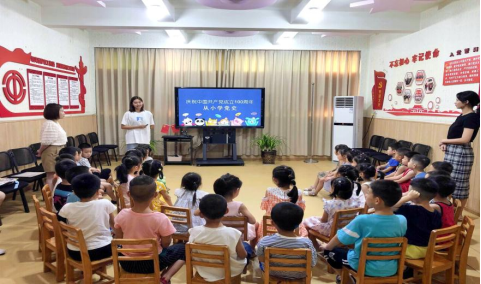 到达幼儿园后,通过与幼儿园园长沟通交流,由幼儿园老师引导小朋友们集中到教室进行党史教育。麻豆社