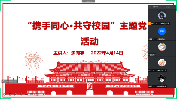 本科制药工程党支部“携手同心·共守校园”主题党日活动在腾讯会议上顺利举行,本科制药工程党支部全体成员参加。