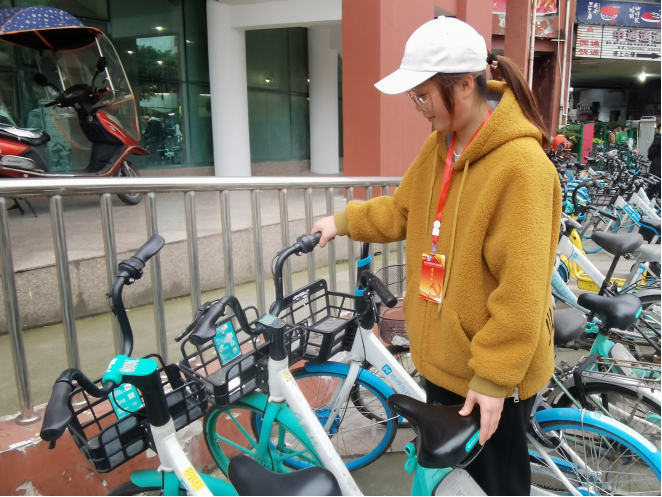 4月17日至4月20日晚上18:00,另一部分同学分别来到了交大各个食堂的门口。只见下课的同学们急匆匆地冲往食堂,留下共享单车把食堂门口围得水泄不通,一时间食堂门口共享单车的摆放混乱不堪。积极分子们将自行车一辆一辆地挪到划定的黄线以内,并将自行车整齐地摆放好,从而把道路空出来,让后来的同学能够顺利通过。