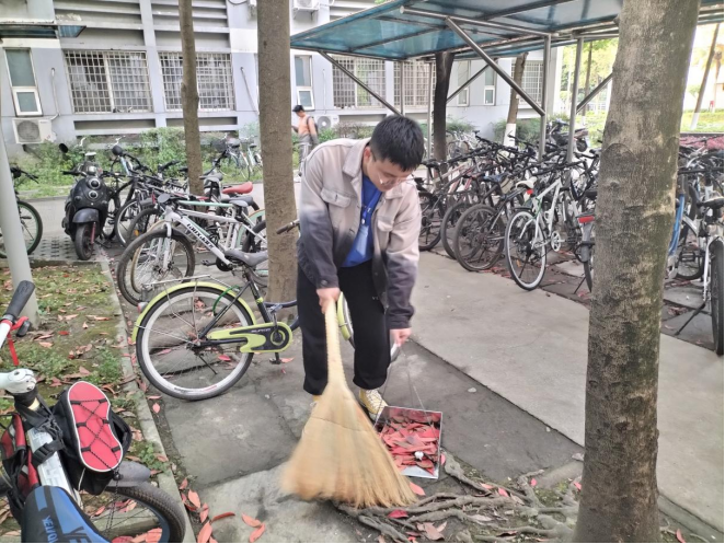 4月15日、17日、19日、21日以及22日的下午18:00,其中一部分同学准时在天佑斋16栋楼底集合,用扫帚簸箕认真地清扫空地的落叶和垃圾。在本次活动期间,即使天气炎热,有时还会刮风下雨,同学们也都坚持把楼底清扫干净。他们用汗水感受劳动人民的辛苦,用实践去服务同学,为大家创造一个更干净整洁的生活环境。