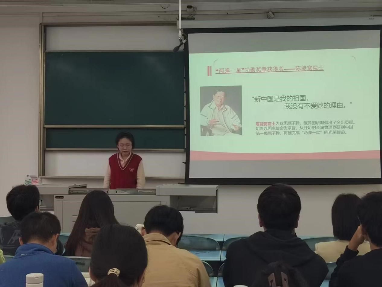 随后讲师为大家介绍了“两弹一星”功勋奖章获得者-陈能宽院士。陈能宽院士为我国原子弹、氢弹的研制做出了突出贡献。始终以国家使命为宗旨,从开始的金属物理到研制中国第一颗原子弹,再到完成"两弹一星"的光荣使命。他曾说过"新中国是我的祖国,我没有不爱她的理由。"这样一句话。字字带着对于祖国的深厚感情。