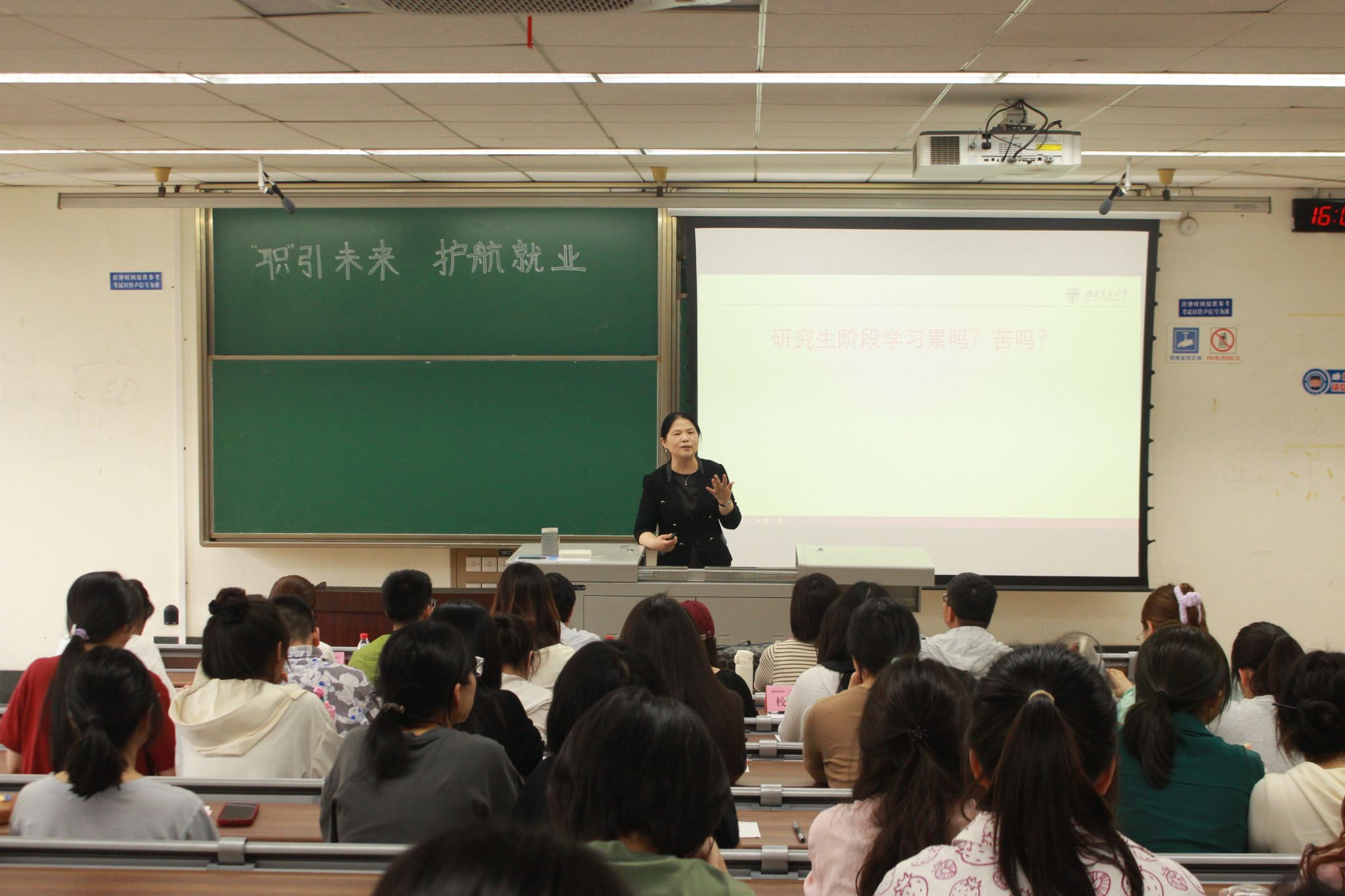 党委书记黄春蓉进行就业情况分析及介绍,为学院学子理清职业规划道路及方向。出席本次会议的还有学院党委副书记朱炜、学院团委书记高鹏及全体研究生辅导员。