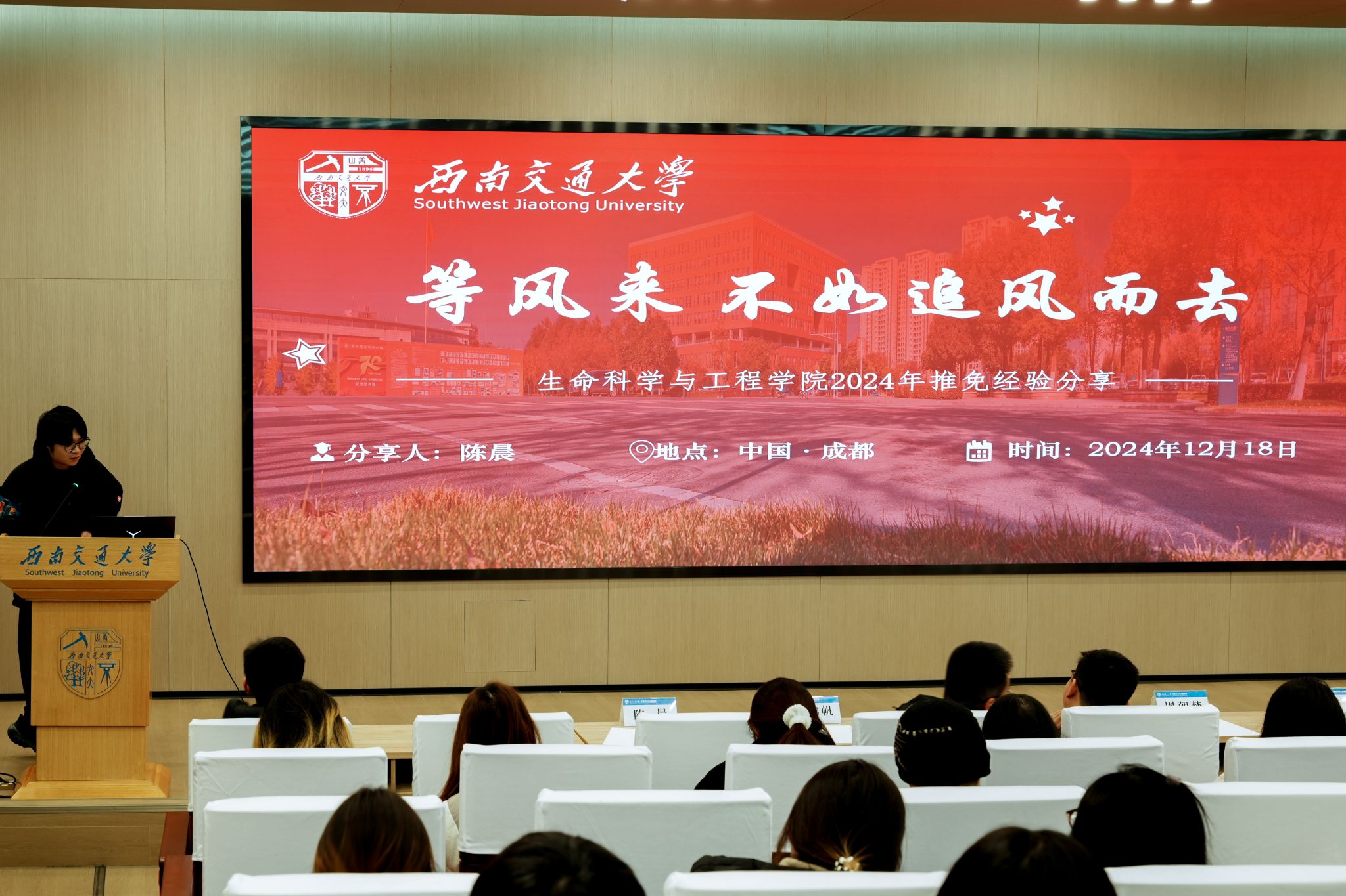 随后,2024年竢实扬华奖章获得者、学院青年讲师团成员陈晨同学分享了宝贵的推免经验。陈晨同学认为推免成功的关键在于明确目标、合理规划学术路径,并提前准备推免材料,突出个人优势。材料的精细打磨和导师的有效沟通是争取机会的核心环节。