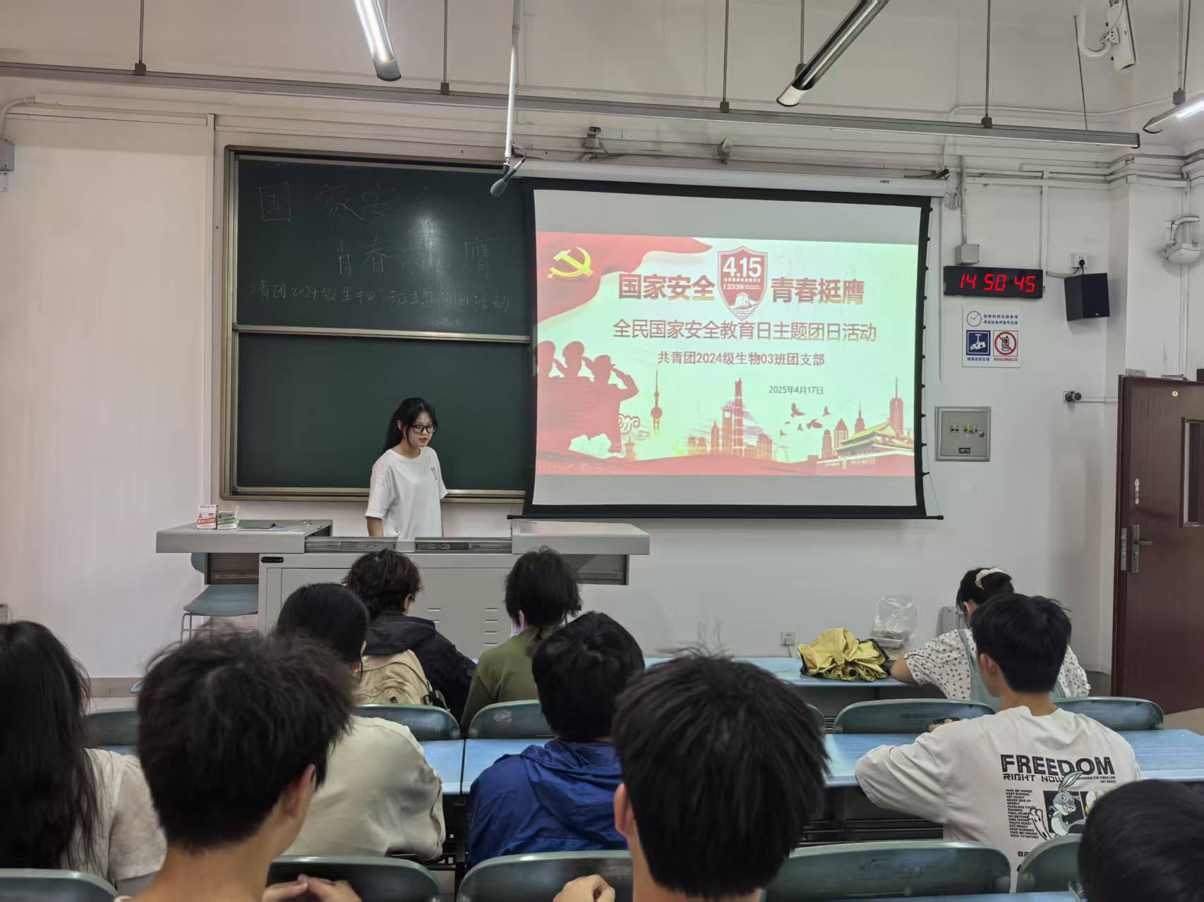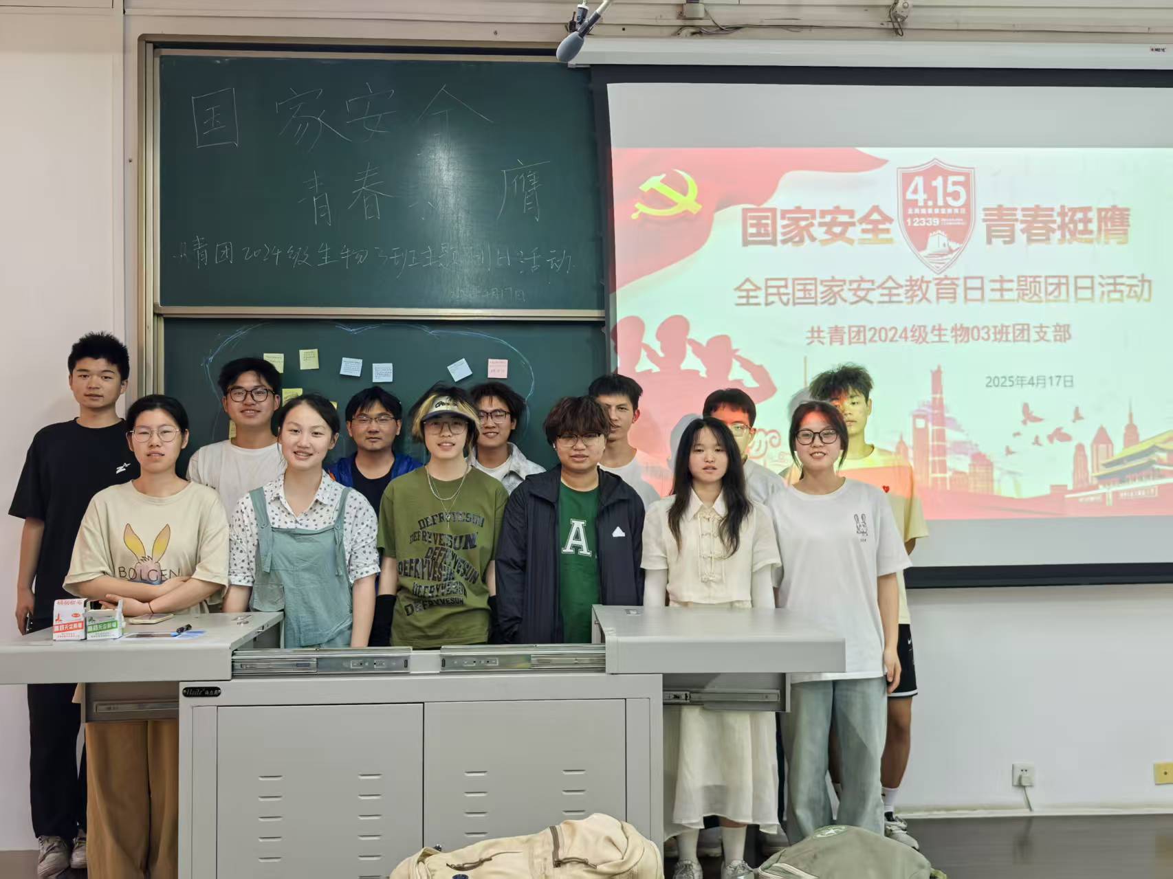 为深入学习贯彻总体国家安全观,厚植青年学生国家安全意识,激发新时代青年的责任担当,在第九个全民国家安全教育日到来之际,生物2024-03班团支部于2025年4月17日成功举办“国家安全,青春挺膺”主题团日活动活动聚焦国家安全知识普及与典型案例分析,通过多样化的形式,引导同学们深入了解国家安全内涵,全面提升国家安全素养。