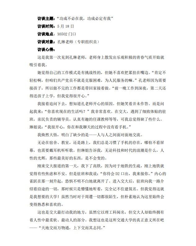 开展了“功成不必在我,功成必定有我”劳动人物访谈活动,同学们分别前往X6501、X6504、X6508办公室,及食堂、物业服务中心、保安厅,共六处地点进行劳动人物的访谈。与在平凡岗位上奉献的他们进行交流,通过倾听访谈人员的介绍,进一步感知身边劳动者工作的辛苦,了解劳动者平时的工作情况。访谈结束向劳动者赠送鲜花,表达对劳动者的尊敬和感谢。
