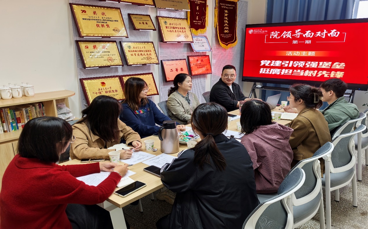2024年10月16日下午,“院领导面对面”第一期活动在九里校区X3604会议室举办,出席活动的院领导是学院党委书记黄春蓉。本期活动以“党建引领强堡垒 挺膺担当树先锋”为主题,参加交流活动的是学院研究生辅导员黄斌翰、李麒麟和研究生党支部委员代表,本次主题聚焦研究生党支部建设和党员先锋模范作用发挥,以轻松开放的方式开展师生党建工作交流沟通以及工作经验分享。