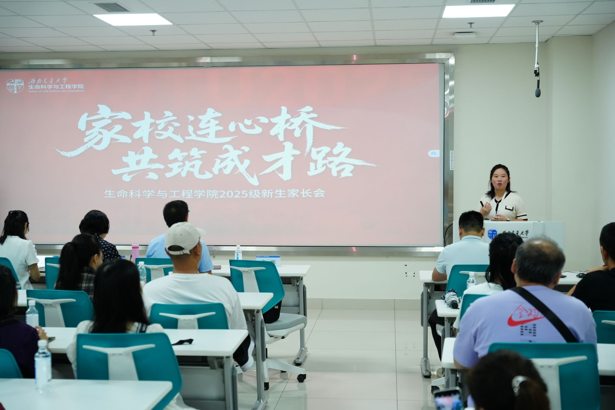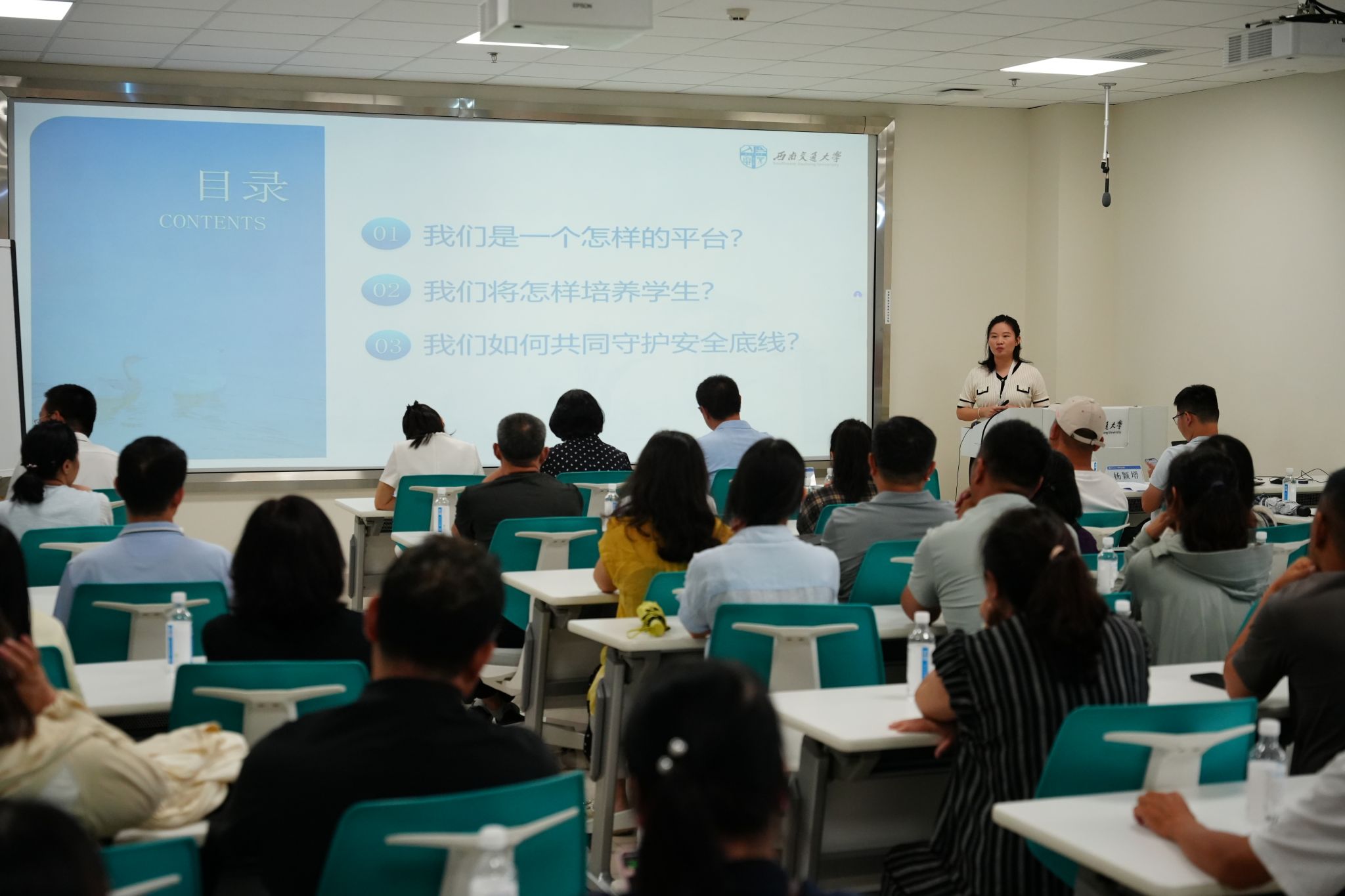 在犀浦校区隆重举行2025级新生家长见面会。学院党委书记黄春蓉、心理研究与咨询中心心理健康教育教研室主任杨兴鹏、学院副院长陈琳、学院党委副书记高鹏,本科生新生辅导员金鹏帆、贺晶晶,以及90余名新生家长代表共同参与了本次活动。会议由学院团委书记杨颖增主持。