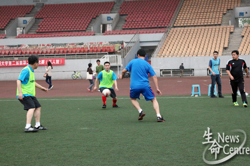 老师的坚守下,双方赛事一直呈胶着状态,各不相让,比分持续为0:0,六点四十五,体育部在多方努力下终于踢进本场比赛的第一个球。下半场开始,麻豆社