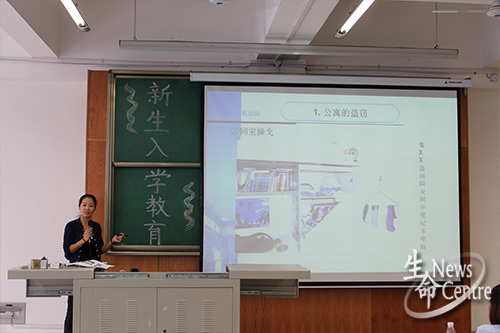 首先,罗妍妍书记就安全知识专题对新生进行了教育,她将安全问题主要分为防盗和防骗两个部分。她强调,防盗主要是防公寓盗窃和公共场所的盗窃,按照以前的实例来看,公寓盗窃主要有溜门盗窃、同室操戈、盗(骗)取钥匙盗窃和撬门盗窃等。而公共场所的盗窃又有盗取银行存款、自行车盗窃等手段。在防骗方面,罗书记希望我们能特别注意推销员假装学生进入学生公寓的行骗行为。临近四点,在热烈的掌声中,罗书记结束了她的演讲。