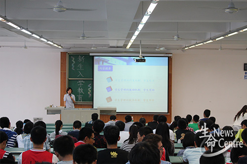 接着,孔琳老师从学校的处分机制和奖励机制两方面就学生管理专题对新生进行了教育。孔琳老师特别强调,考试作弊是十分不好的行为,学校对作弊者从不手软,最少也是严重警告处分。但同时,学校的奖励机制也是十分丰富的,有国家励志奖学金,综合奖学金等多种奖学金,希望听了孔老师的演讲后,新生们能够以认真务实的态度努力学习。