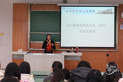 会议开始,李遂焰老师首先向2011级同学介绍了毕业论文的重要性。她指出毕业论文是本科学习阶段的重要环节,是综合运用所学各学科的理论与方法的重要阶段,通过该环节对实际问题进行分析与研究,得出有价值的结论,同时体现出一定的独立分析问题与解决问题的能力。接着,她从毕业设计的进度安排、基本组成、教师指导及规范程度等方面进行阐述,提醒同学们合理安排好时间,按照规范要求正确的完成毕业论文的工作。