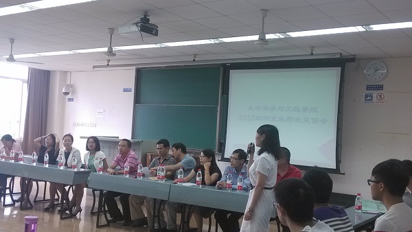 2015级研究生师生见面会在逸夫楼4407B教室举行。本次师生见面会由研究生辅导员贺妍老师主持,采用圆桌会议的形式,学院党委李卓慧书记、学院院长周先礼教授、学院党委罗妍妍副书记、学院副院长马超英教授、李遂焰副教授、院长助理袁艺副教授、生物工程系主任喻凯教授、药学系主任闫智勇教授及部分研究生导师与全体新生进行了面对面交流,整个会议显得既庄重团结、又轻松活泼。。