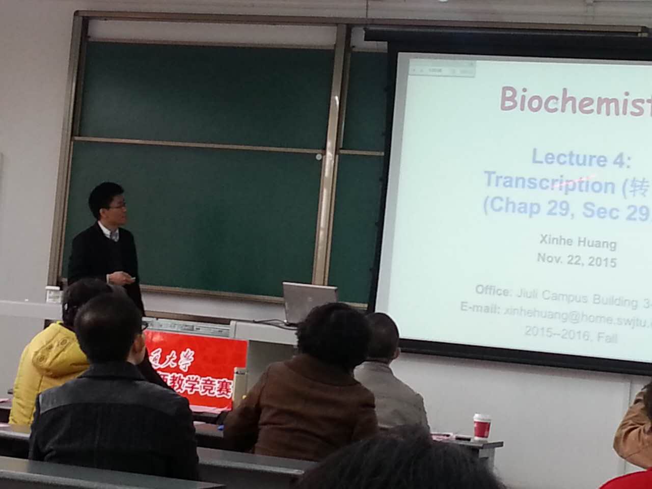 孟涛老师和黄新河老师分别进入了理工基础决赛组和外语双语决赛组。孟涛老师主讲《生物反应工程》,启发式的教学方式,探究性的课堂实验,精彩的讲课充满激情,最后在与学生互动中圆满地结束了讲课,获得评委们的一致好评,并荣获本届教学竞赛一等奖。黄新河老师主讲《生物化学》(双语课程),熟悉的专业、流利的英语、自信的讲课和愉快的课堂教学,给评委们留下了良好的印象,并荣获本届教学竞赛二等奖。