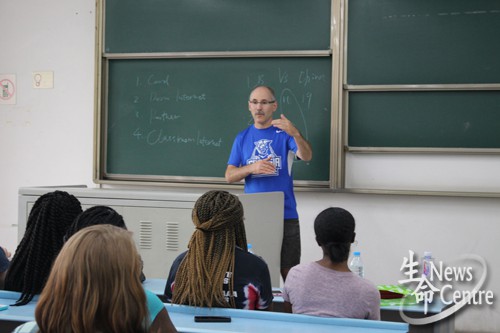 2014级生物工程中美班导师黄新河主持,来自美国乔治亚州立大学的14名学生及其带队老师Eric及来自中美班的21名同学参与了本次活动。
