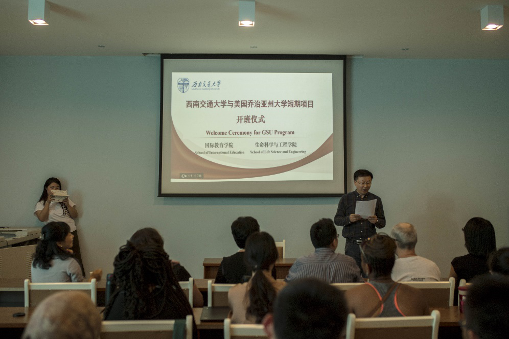 高峰副院长致辞。他着重为交换生们介绍了四川与成都的人文。接下来,GSU交换生学生代表Alicia Edwards做简短发言,她表达了第一次来到中国的欣喜与期待之情,同时希望能与中国小伙伴们相互学习交流、共同进步。