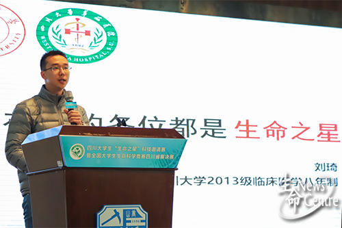 在“生命之星”科技邀请赛五周年之际,大赛组委会邀请到往届竞赛一等奖获得者,来自四川大学的刘琦同学发言。他向大家分享了两次参加“生命之星”科技邀请赛的经历以及与西南交大产生的特别情愫,赛事的学术专业性及“盲审”过程让他印象深刻,准备比赛的过程中不受干扰,专注于自己的每一个试验、每一个细胞、每一只小白鼠和每一个发明创造。“生命之星”赛场上严谨的科研实验设计、巧妙的发明创造,拓展了他对各个领域的认知与了解。他感到在这里的参赛选手不是对手,而是一个个满怀希望走进知识殿堂,探索未来的“生命之星”。