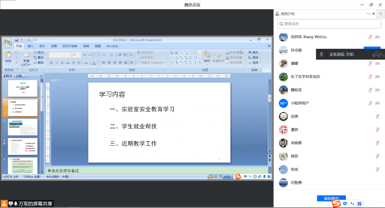 为进一步落实实验室安全管理制度,强化老师们的实验室安全防范意识以及对本科同学的就业帮扶,药学系教师于2022年6月2日开展了 “实验室安全教育及就业帮扶研讨会”。会议由药学系主任万军主持,药学系教师积极参与。