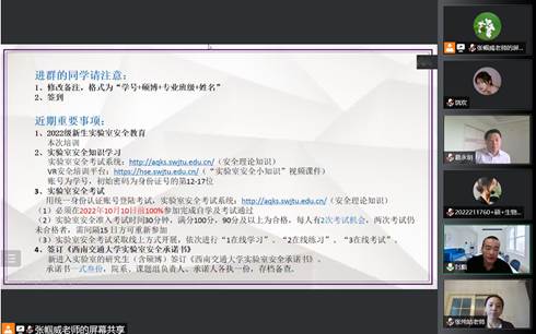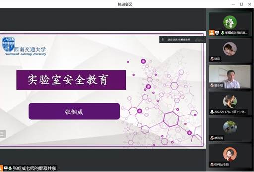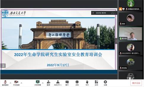 在线上为2022级研究生新生(含硕博)开展了实验室安全教育培训。学院党委书记葛永明、学院副院长封顺、院长助理(实验中心主任)张纯姑、实验中心副主任单连海、科研实验室安全员张帼威以及研究生辅导员老师们出席了培训会。2022级研究生新生(含硕博)共183人参加了培训。会议由实验中心副主任单连海老师主持。