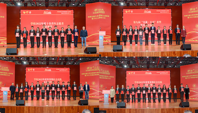 获评四川省社会实践优秀品牌项目1项;获第九届“交通·公益”志愿服务季优胜奖;4位老师获得共青团实践育人优秀指导老师;9名同学获得社会实践校级优秀队员;3支队伍获得社会实践校级优秀队伍。校党委副书记余敏明出席大会,并向获奖集体及个人颁奖,学院党委副书记朱炜、团委书记高鹏及学生代表出席此次大会,学院青协会会长钟诗怡以《君子履正道,实践育新人》为题做工作分享报告。