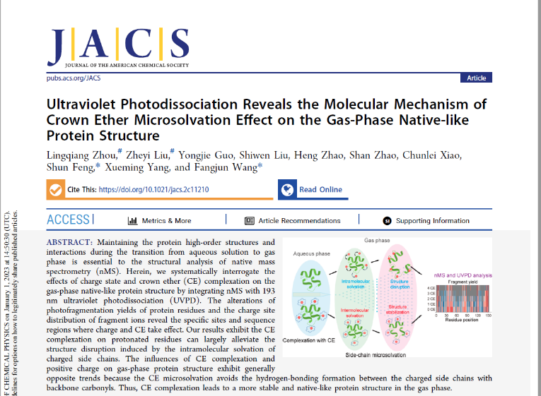 “生命分析技术与材料”封顺教授团队与中国科学院大连化学物理研究所王方军教授和杨学明院士团队合作的最新研究成果“Ultraviolet Photodissociation Reveals the Molecular Mechanism of Crown Ether Microsolvation Effect on the Gas-Phase Native-like Protein Structure” (DOI: 10.1021/jacs.2c11210)。论文共同一作为我校2020级硕士研究生周伶强和中科院大连化学物理研究所刘哲益副研究员,通讯作者为封顺教授和王方军研究员,麻豆社