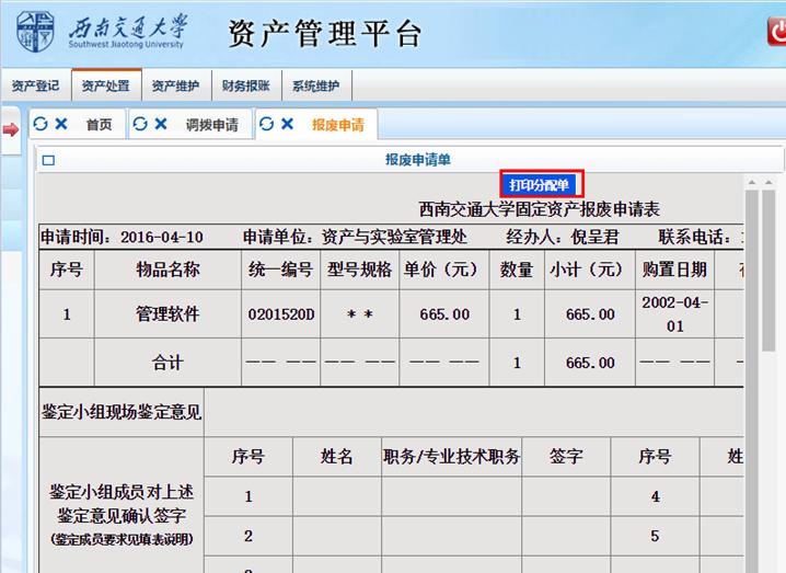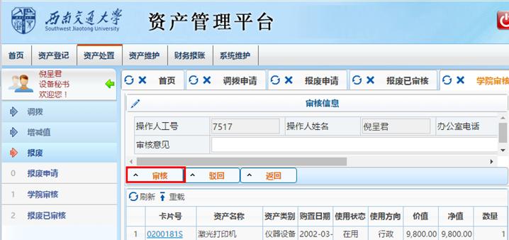 1、设备秘书依次点击资产处置、报废、学院审核、报废申请号