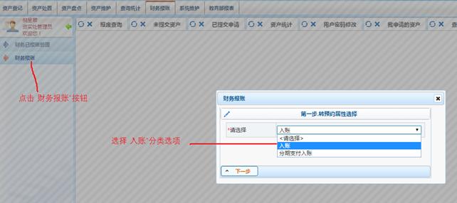 如在成都校区计财务处入账,则选择“资产入账”窗口,如在峨眉校区财务处入账,则选择“峨眉资产”窗口。然后点击下一步。