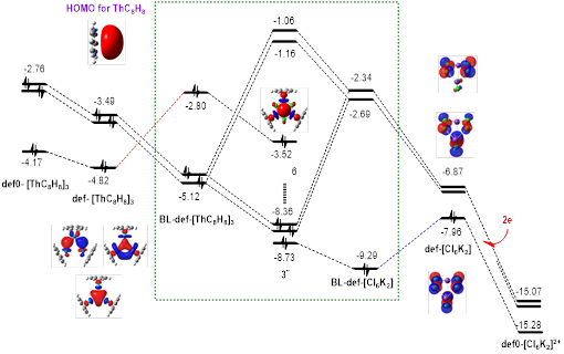 首先,研究者提出了一种新型的“核-壳共生键模型”来描述Th3Cl6笼状中心的化学键。具体而言,除去与配体形成配位键的2个电子外,钍金属中心(Th6d27s2)可提供2个价电子参与形成Th3Cl6笼状物。因氯原子吸电子能力强,三个钍金属中心的6个价电子全部被六个氯原子夺去,进而使得Th3金属簇内部没有剩余的电子可形成化学键(如2右所示)。然而,通过引入两个钾原子或自由电子,外部Cl6基团将释放两个电子在Th3金属簇内部形成化学键 (如2左所示)。由此可知,-壳共生键模型由内部小分子金属簇形成的3c-2e金属键 (Th3) 和外部涉及12个电子的多中心电荷转移键 (ThCl2)3组成。 为进一步揭示 -壳共生键”的形成机理,我们使用原位轨道相关图演示了Th3金属簇与外部Cl6基团的轨道相互作用 (见图3)。