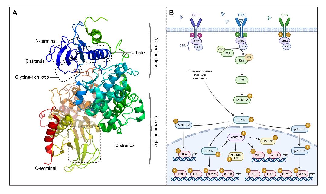ERK有两种亚型(ERK1和ERK2),它们84%的氨基酸残基相同。ERK1/2具有典型的蛋白激酶特征结构双叶型折叠,通过磷酸化底物对细胞生命活动进行调控。其N端结构结合ATP以定位其β和γ磷酸基团,而C端结构则催化ATP的磷酸基团转移到ERK1/2的底物上。细胞因子、激素和细胞应激等胞外信号通过多种跨膜受体进入细胞,并沿RAS-RAF-MEK-ERK传递到细胞内,从而调控细胞的重要生命活动。在这个过程中,ERK1/2是MEK的唯一底物,却可以磷酸化数百种下游细胞质和细胞核底物,可见其在胞外信号向胞内传递过程中的重要性。